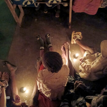Vigilie začala kolem sedmé venku u ohně. Kostel se nezvětšil ani dnes, byli jsme s dětmi vzadu na zemi a různě na nás pospávaly. Ne všichni měli svíčky, tak jsme naši svíci trochu naporcovaly a rozdaly. Děti byly líné je držet, tak si třeba nakapaly vosk a přilepily si je na zem nebo na ruku 😉. Mše trvala cca 4 a čtvrt hodiny, a to se nekonal žádný křest. Ty se všechny odbyly už na Vánoce.