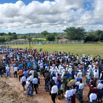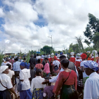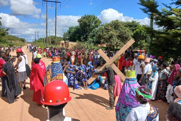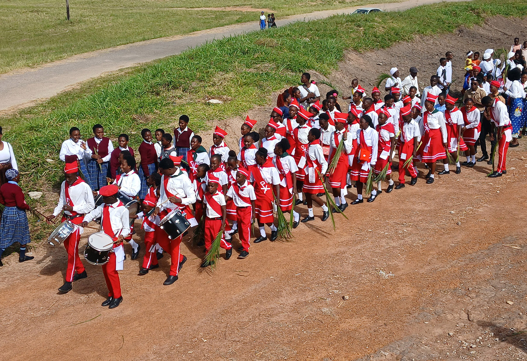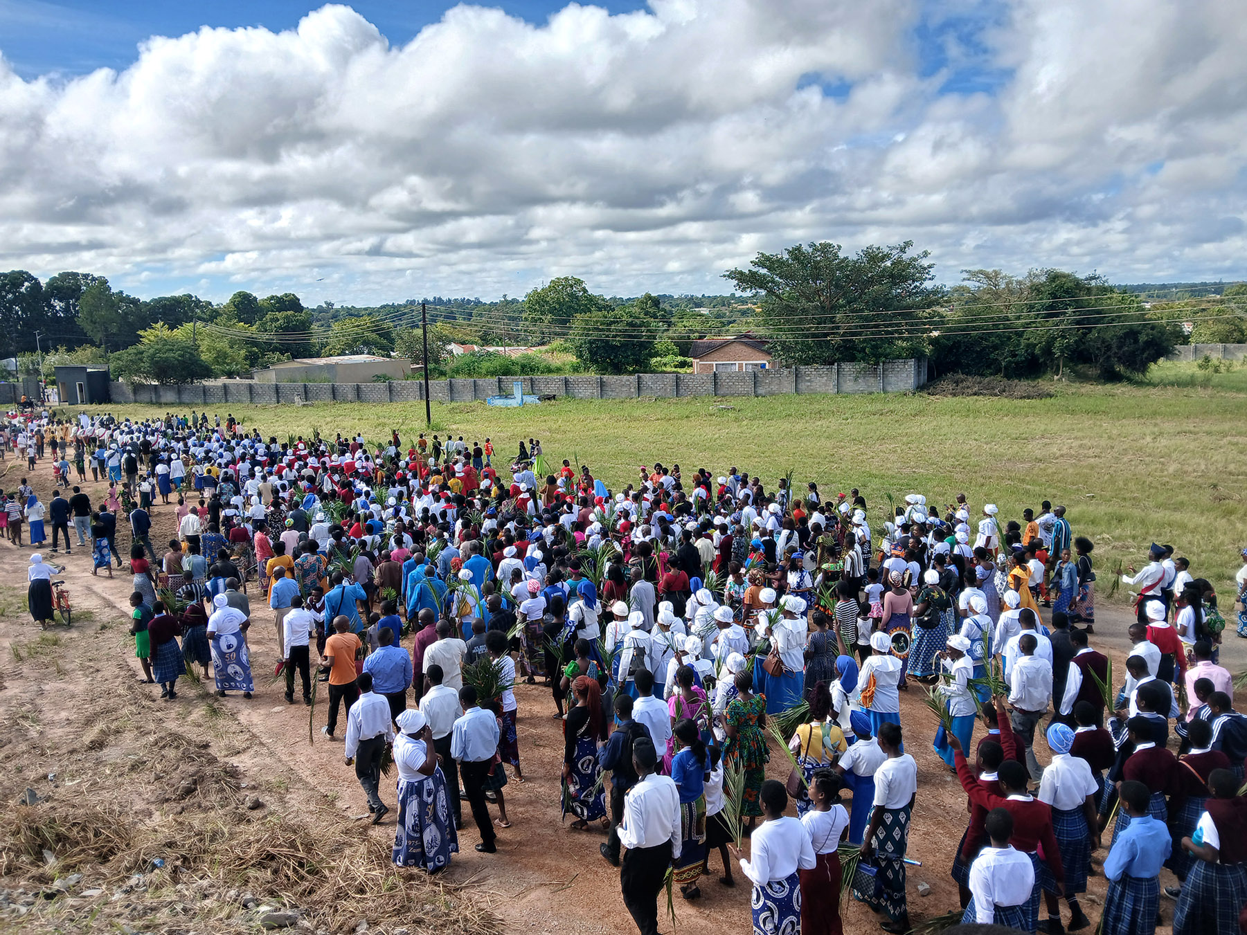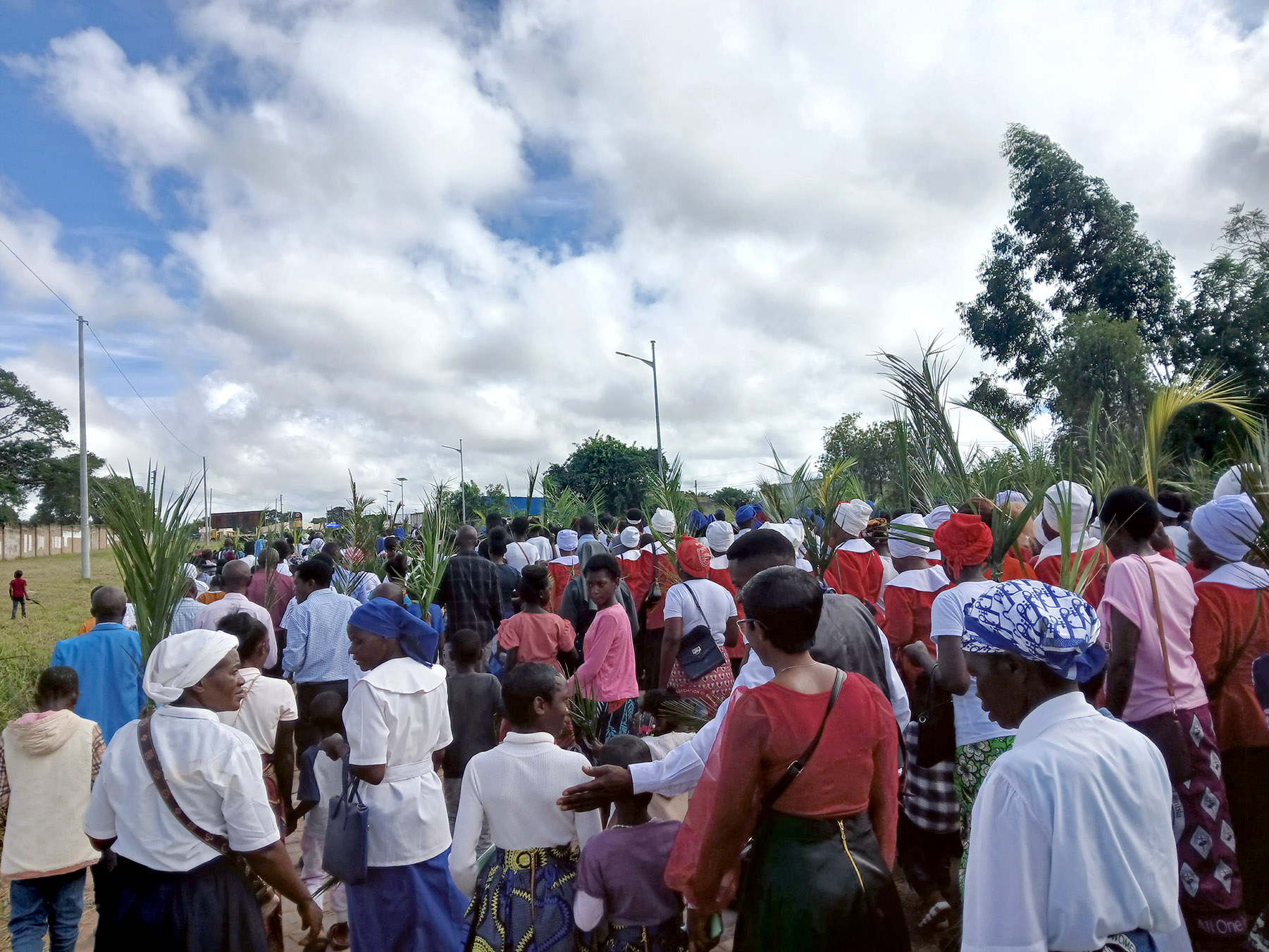 Opravdu byla palmová. Slavit jsme začali kolem osmé ráno ve městě na stadionu. Měli jsme tu ekumenické křesťanské setkání. Dokonce tu byla i farářka! To mě docela příjemně překvapilo.  Po čtení, kázání a modlitbě bylo požehnání palmových ratolestí a pak se na ně všichni doslova vrhli. Bouřlivě mávající palmovými větvičkami nad hlavou jsme se pak za doprovodu bubnů a zpěvů vydali přes město průvodem ke kostelu. Jednotlivé farnosti se cestou oddělovaly. Když jsme dorazily, měli jsme slavností mši v bembštině. Pašije byly zpívané, ale potěšilo mě, že jsem znala nápěv. Do haly, kde se mše konala, jsme se moc nevešli. S dětmi, co se na nás nabalily, jsem se mačkali v uličce. Dokonce na mě v průběhu jedna holčička usnula 😉. Mše se stihla asi za 2 a půl hodiny. Takže v půl druhé jsme se mohli vydat domů na oběd.