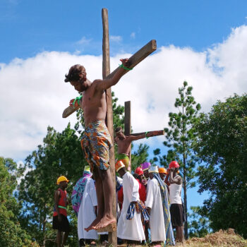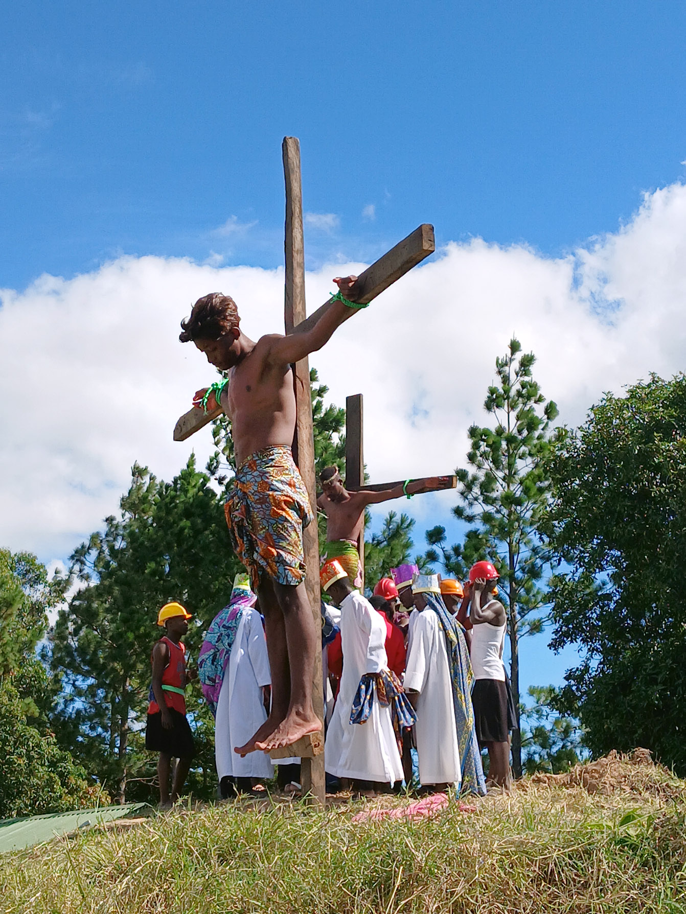 Ráno byl nějaký program a zpovídání ve farnosti. My jsme se připojili ve 12:30, kdy měla začít křížová cesta. Chvílí jsme čekali, překvapivě jen půl hodiny, ve 13 se začalo. Celý pašijový příběh i křížová cesta, vše bylo hrané místní mládeží. Ale teda bylo to něco. První hodinu jsme strávili ještě na místě, divadlo začalo poslední večeří. Herci plynule přecházeli po celém prostranství, takže my – diváci jsme různě přebíhali, abychom alespoň trochu viděli. Většinu času jsem měla na rameni nějaké dítko, aby trochu vidělo přes tlačící se dav… Zhruba po hodině jsme vyrazili do ulic následovat Krista na křížové cestě. Procházelo se mezi domečky a zastavovalo na jednotlivá zastavení. Nakonec jsme dorazili na naše fotbalové hřiště, kde je po straně takový vyvýšený pahorek, kde byli Ježíš a oba lotři ukřižovaní. Opravdu se jim povedlo vztyčit kříže, Ježíš i lotři na nich byli přivázaní provazy a nohama stáli na takovém prkýnku zabušeném v dolní části kříže. Celou dobu jsem se ale dost strachovala o jednoho z lotrů, prkno, na kterém stál nevypadalo moc věrohodně. Naštěstí se ale nic nečekaného nestalo. Kristus sňatý z kříže byl pak zabalen do plátna a odnesen do hrobu – kostela, kde začaly Velkopáteční obřady. Musím říct, klobouk dolů před místní mládeží. Člověk měl možnost vše prožít mnohem silněji. Celkově to bylo 2 a půl hodiny divadla, 2 a půl hodiny obřady. Skončili jsme v šest a už se začalo stmívat… Do kostela jsme se opět moc nevešli, skončila jsem s dětmi vzadu na zemi… Večer jsme si ještě v komunitě pustili film Umučení Krista.