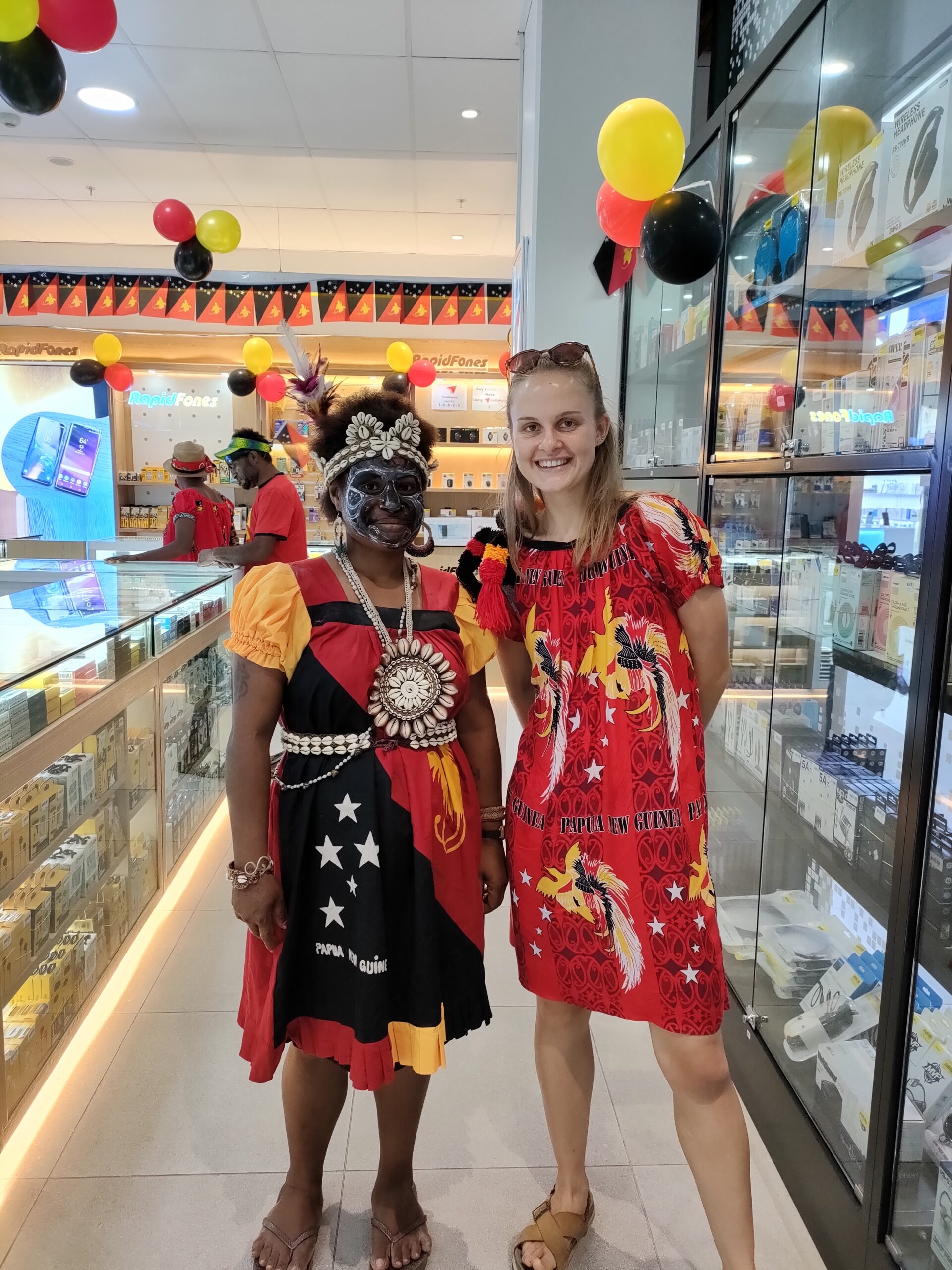 A teď k papuánské módě. Otec Angelo říká, že když se Papuánci oblékají, tak se svlékají. A je to tak. V dnešní době však už jen v případě, že se oblékají na nějaký tradiční rituál, oslavu, kulturní show, prostě někam, kde se hodí jejich tradiční kostým. To na sebe dají v případě žen suknici spletenou z různých listí, mušlí, proutků, na krk velký náhrdelník z květin nebo také mušlí, namalují si končetiny a obličej a jsou oblečené. V případě mužů jde o nějaký šátek, list a pak už jen ty barvy na tělo. Běžně však ženy nosí povětšinou velice barevné šaty, tak zvané meriblaus, a k tomu kabelku zvanou bilum, vyrobenou z proutí či bavlny. Někdy se ladí více do západu a oblečou si normální kraťase a triko, jak u nás. Muži běžně nosí tak nějak co jim přijde pod ruku.